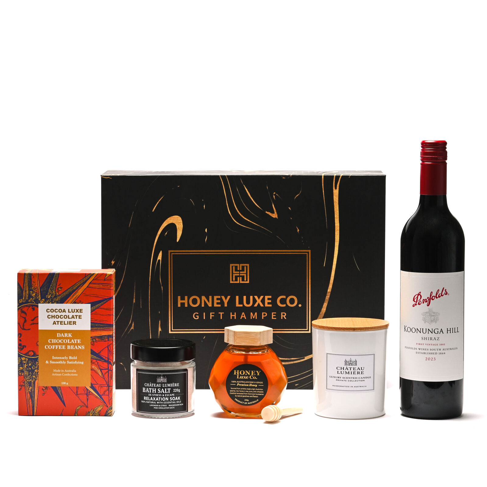 To complement the rich red wine, the hamper features Coffee & Dark Chocolate Bliss, a harmonious pairing of aromatic coffee and smooth dark chocolate. 100% Australian RAW A-Grade Premium Honey adds natural sweetness and purity, enhancing the balance between indulgence and warmth.