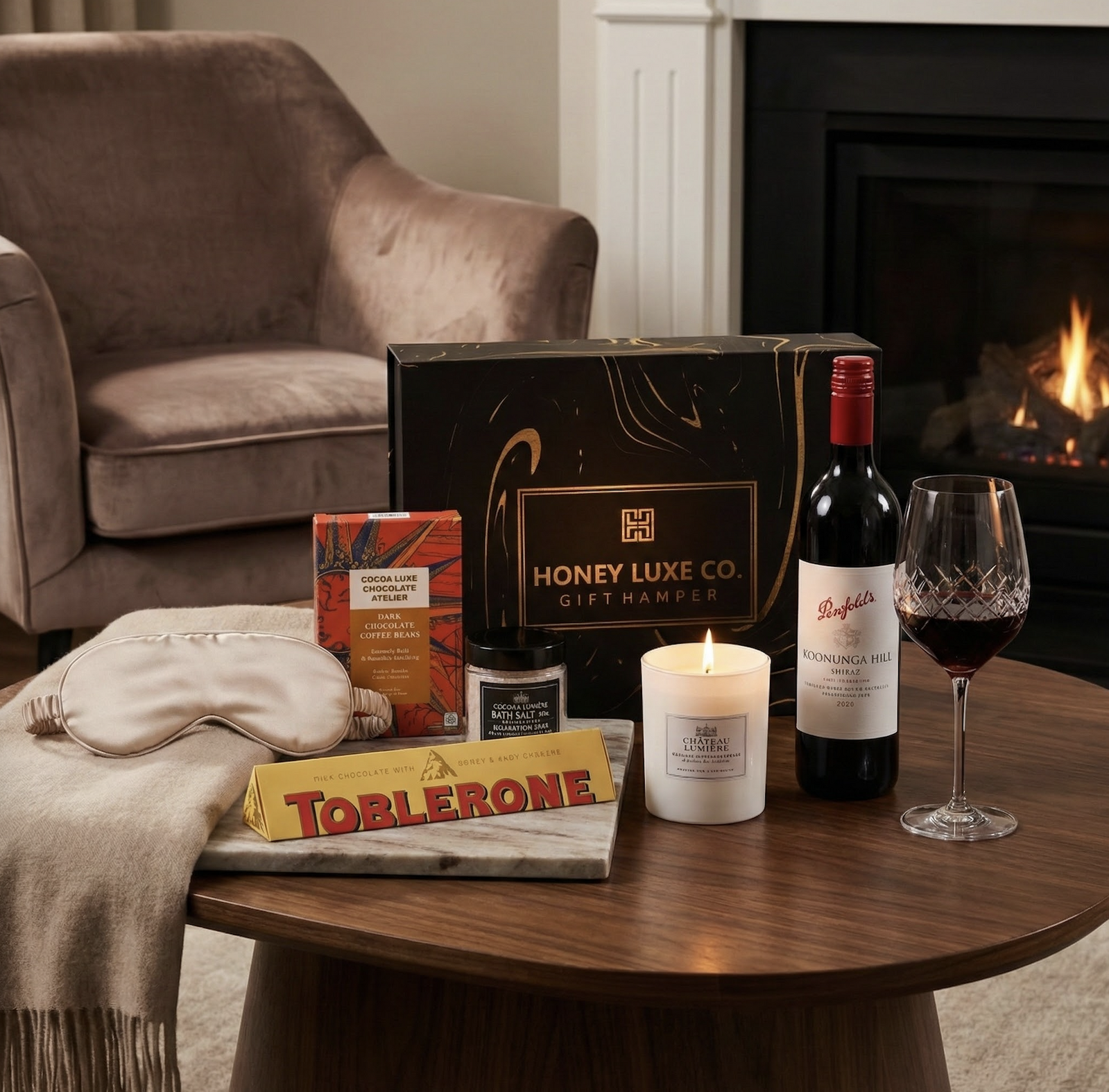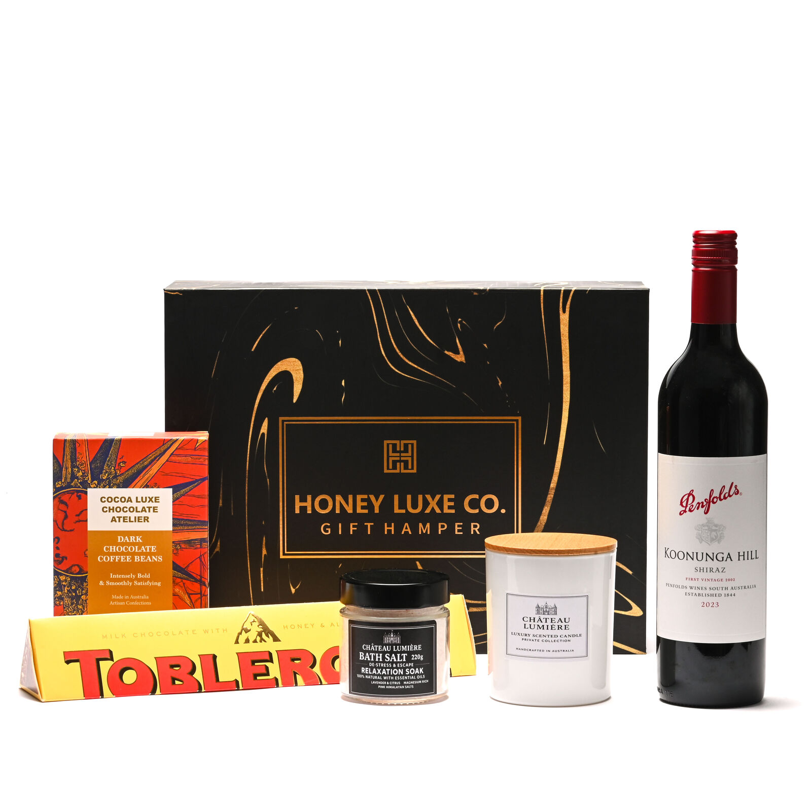 The Penfolds Koonunga Hill Red Indulgence Hamper is a refined showcase of indulgence and elegance — a perfect harmony of fine wine, rich chocolate, and luxurious relaxation.