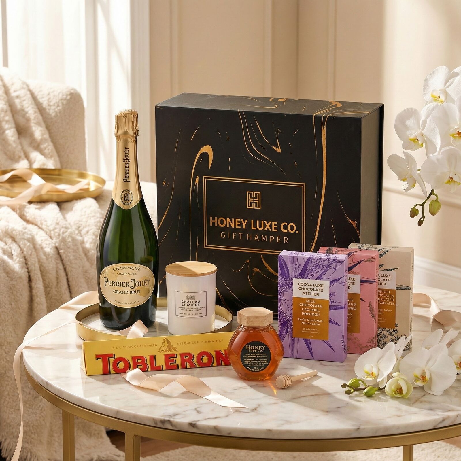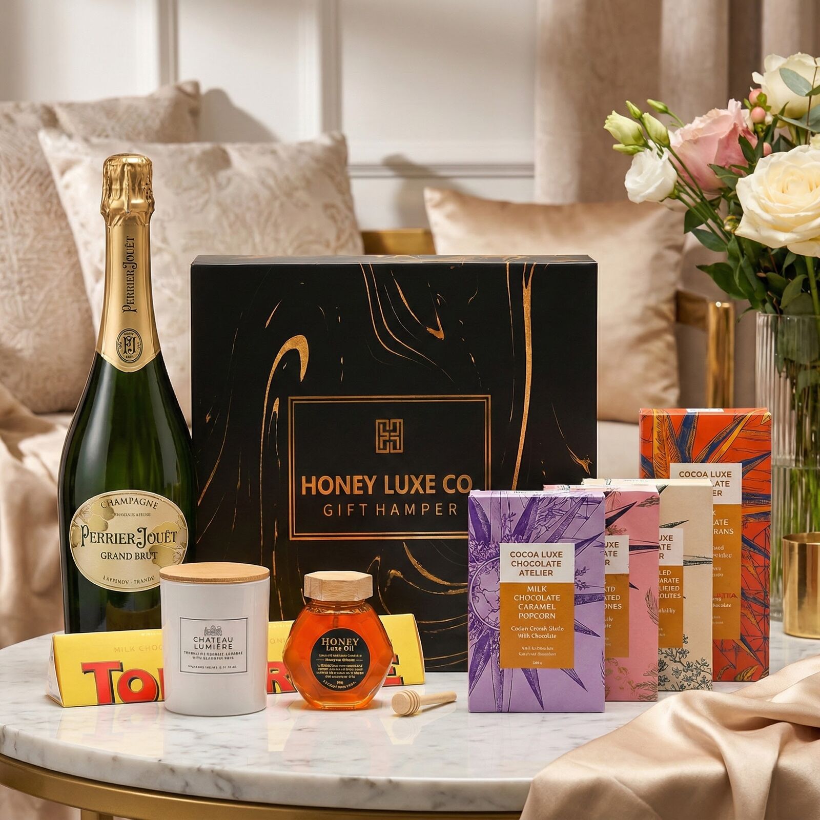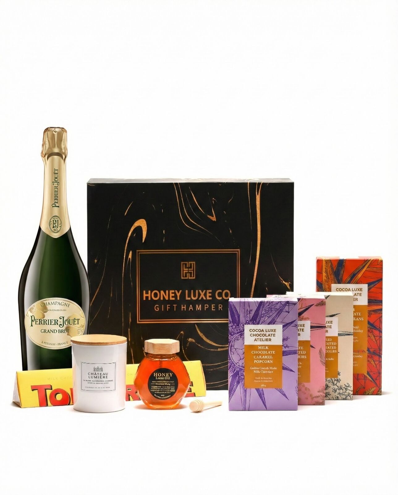 A refined, high-impact gift perfect for elegant celebrations, romance, and premium corporate gifting. Featuring Perrier-Jouët Grand Brut Champagne, this floral, elegant Champagne is paired with an indulgent selection of gourmet chocolates including Toblerone Orange Twist, Raspberry White Chocolate Jellies, White Chocolate Strawberry Bliss, Coffee & Dark Chocolate Bliss, and Golden Caramel Chocolate Popcorn. Finished with 100% Australian RAW A-Grade Premium Honey and a Château Lumière luxury scented candle, this hamper delivers effortless indulgence with a warm celebratory touch.