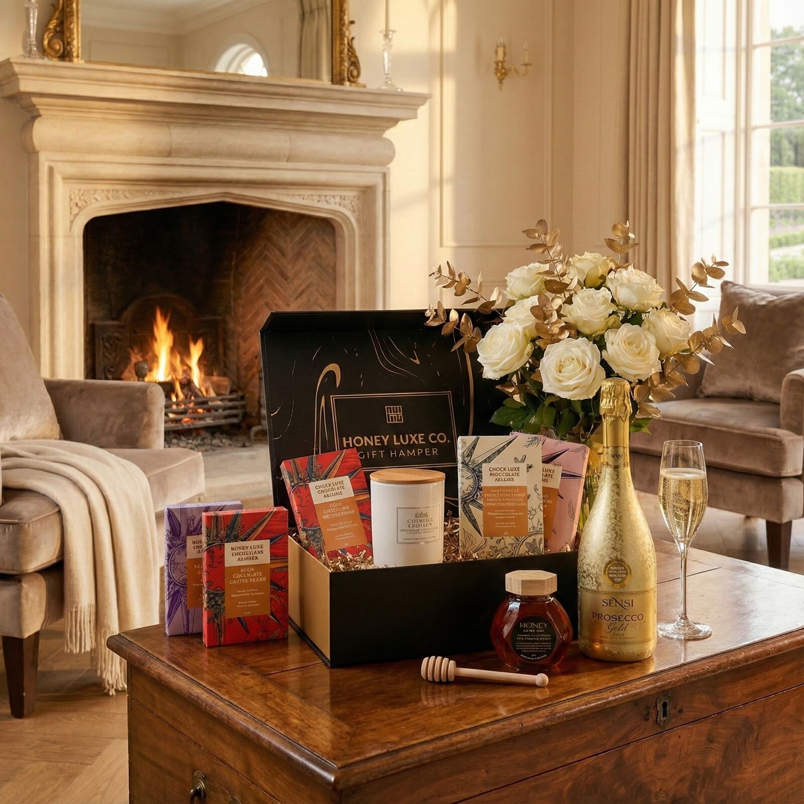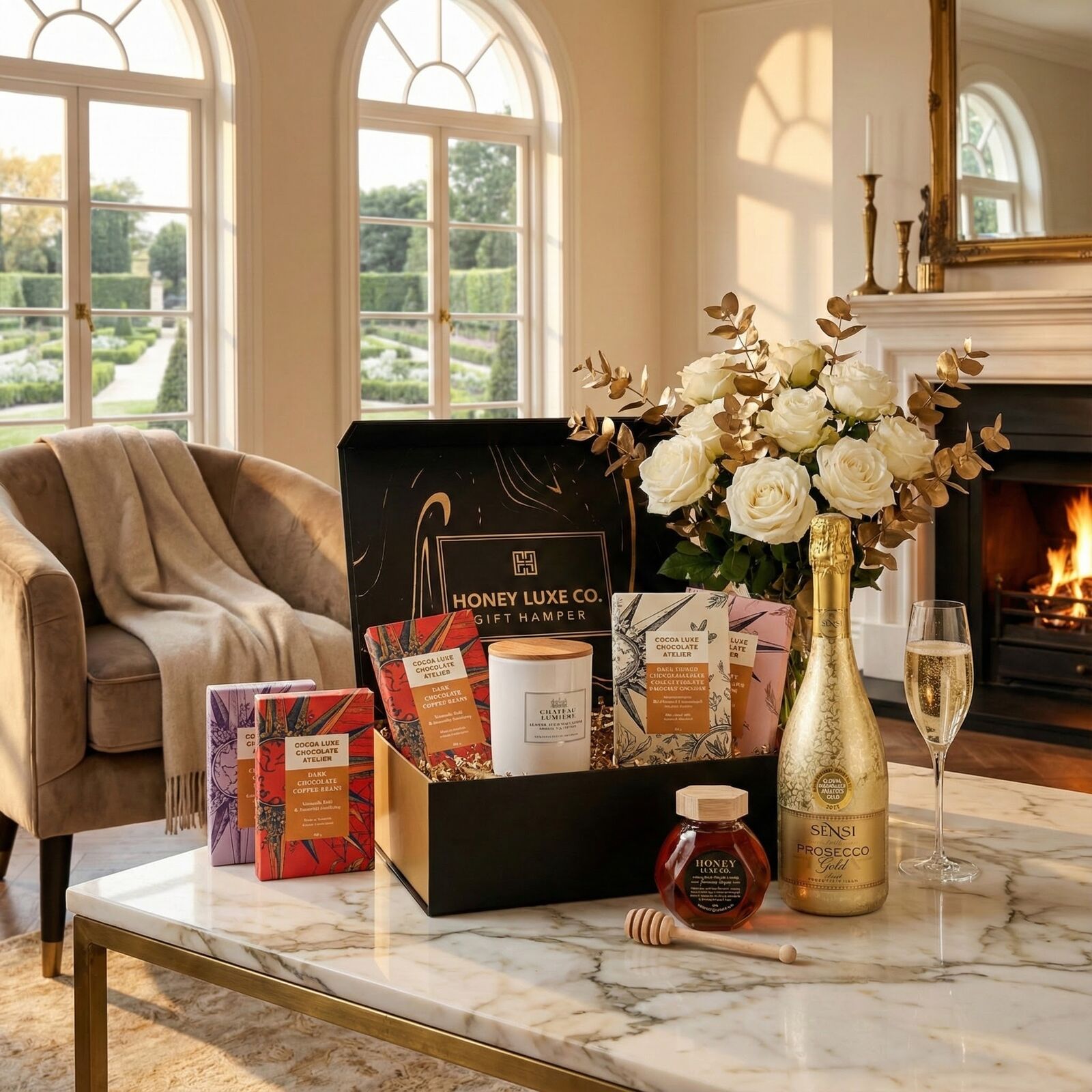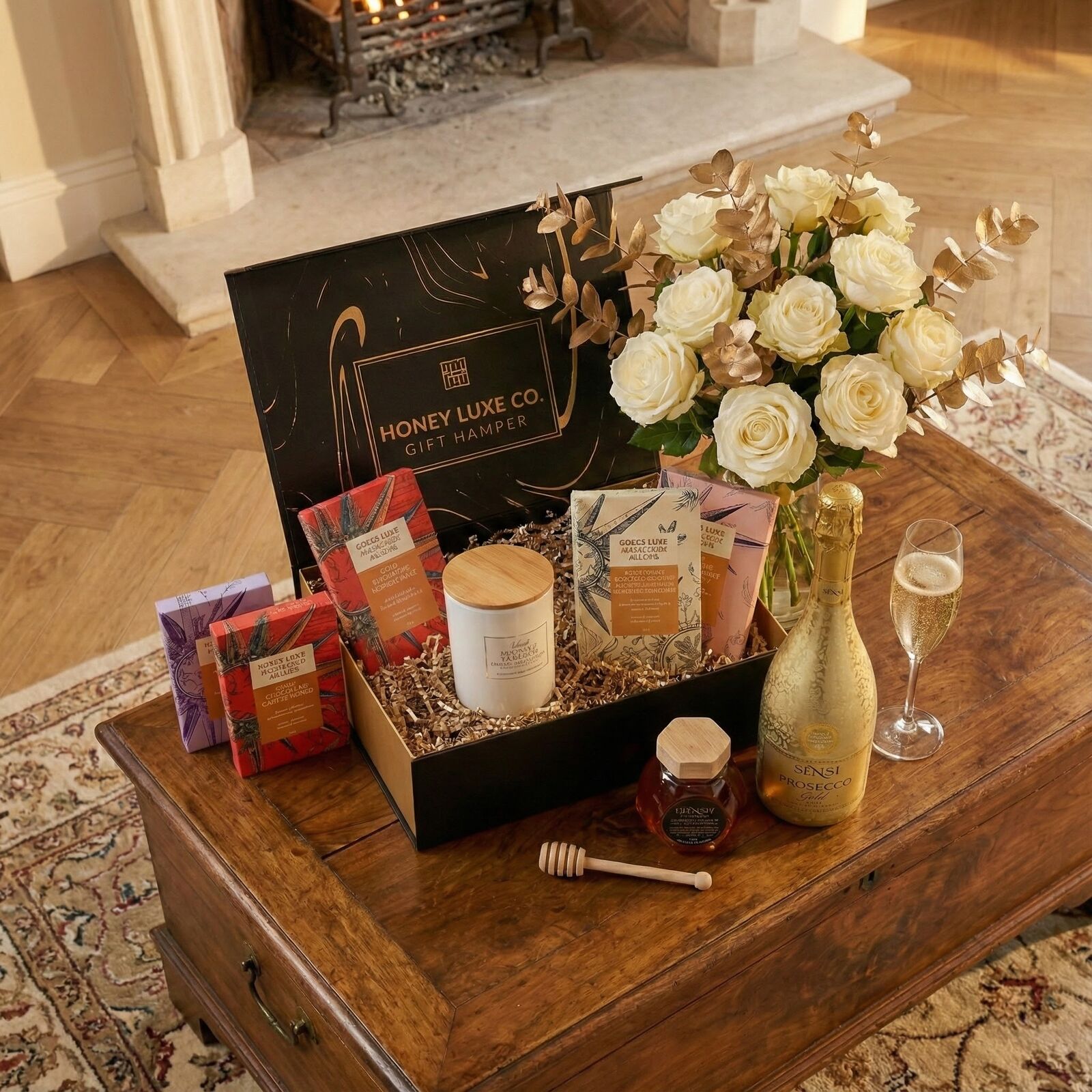 A luxurious hamper with Sensi 18K Gold Prosecco, artisan chocolates, raw honey, two luxury candles and bath salts — perfect for pampering, birthdays and elegant celebrations.