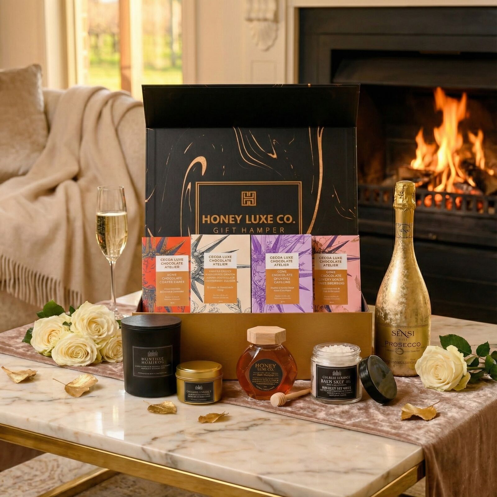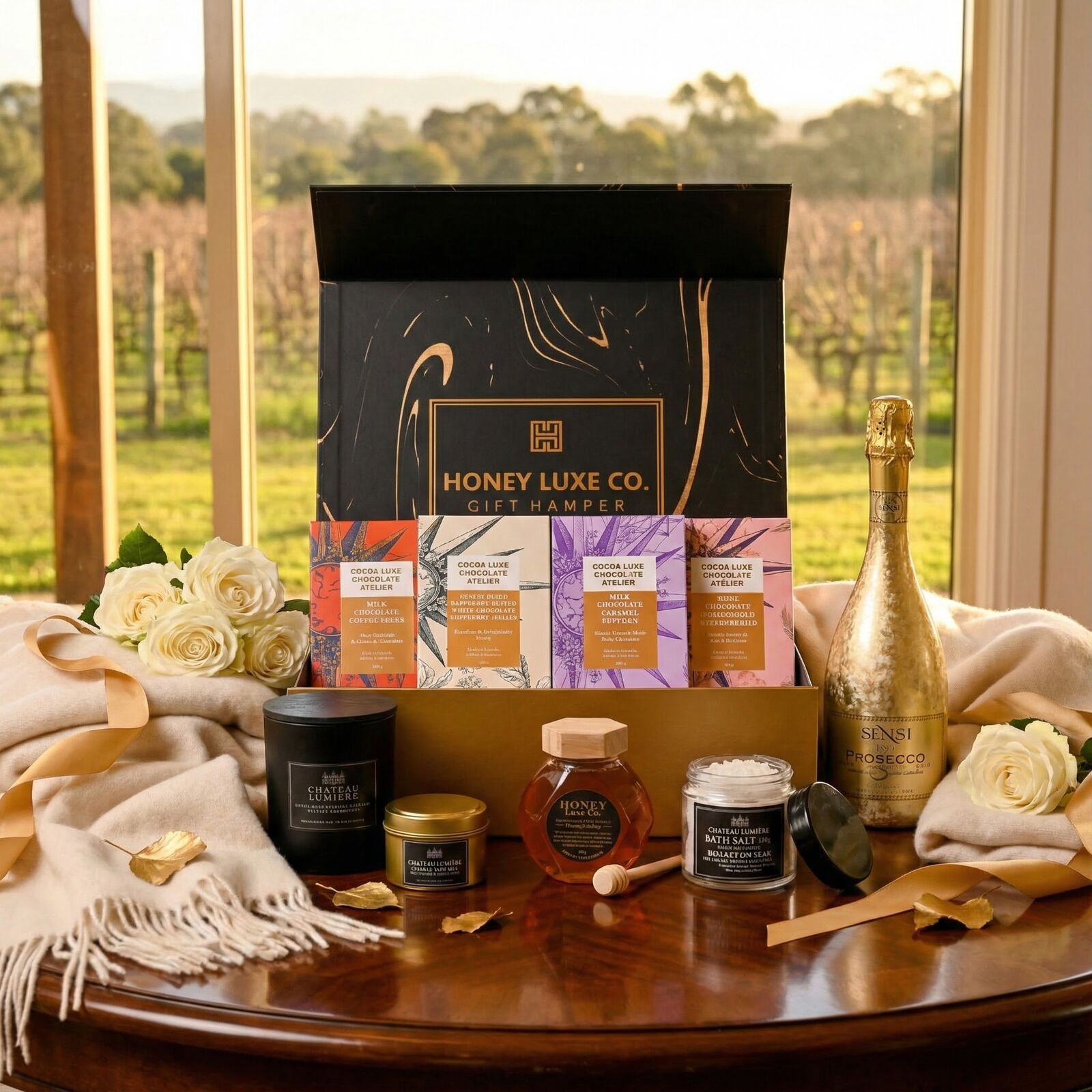 A luxurious pamper hamper featuring Sensi 18K Gold Prosecco, artisan chocolates, raw honey, two luxury candles and bath salts — perfect for birthdays, celebrations and indulgent self-care gifting.