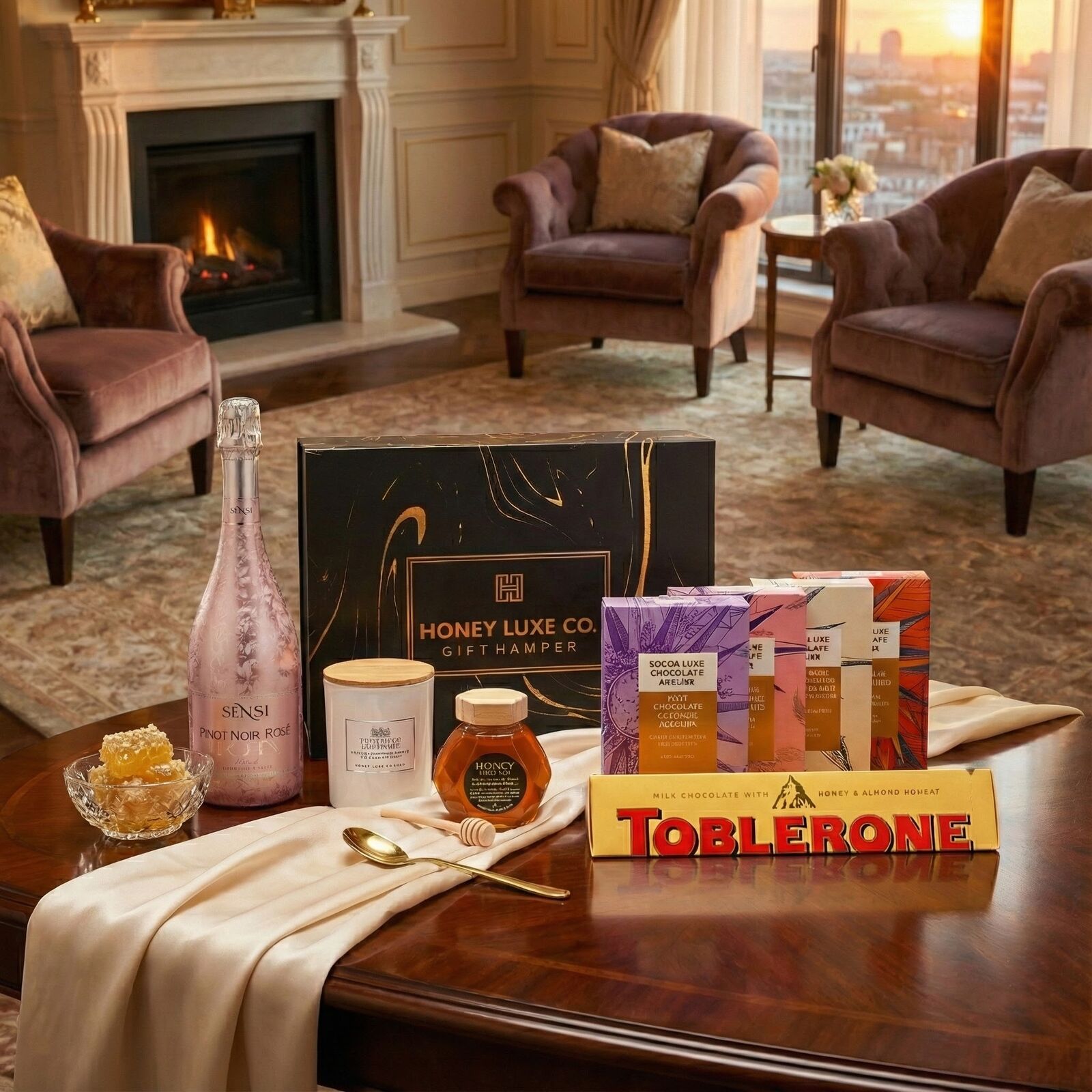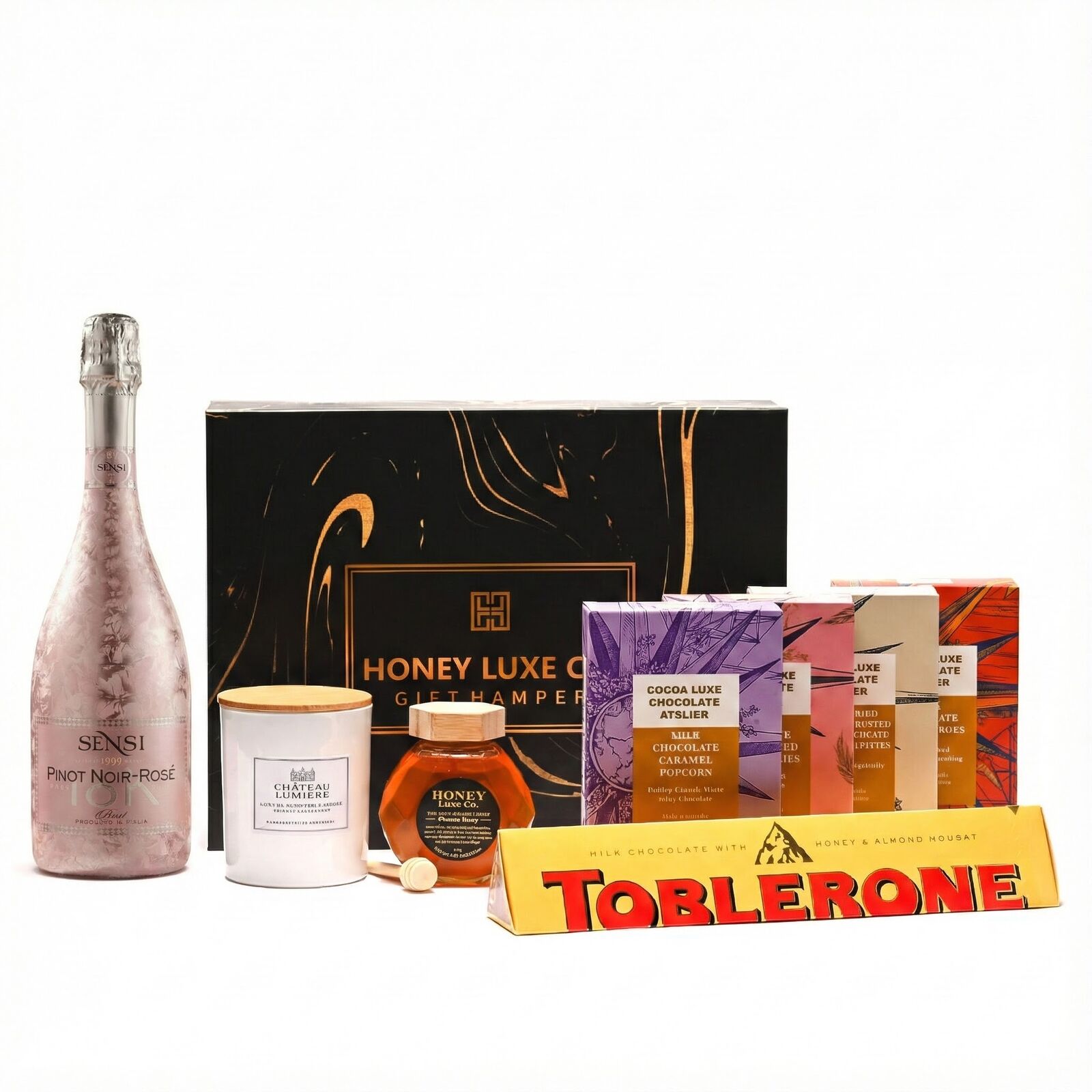 A luxurious hamper featuring Sensi 18K Rosé Prosecco, artisan chocolates, raw honey and a premium candle — perfect for birthdays, anniversaries, corporate gifts and romantic celebrations. The stunning 18K Rosé Prosecco is paired with Toblerone Orange Twist, Raspberry White Chocolate Jellies, Strawberry Bliss, Dark Coffee Chocolate, and Golden Caramel Popcorn for a rich, indulgent treat. Finished with 100% Australian RAW Honey and a Château Lumière Candle,