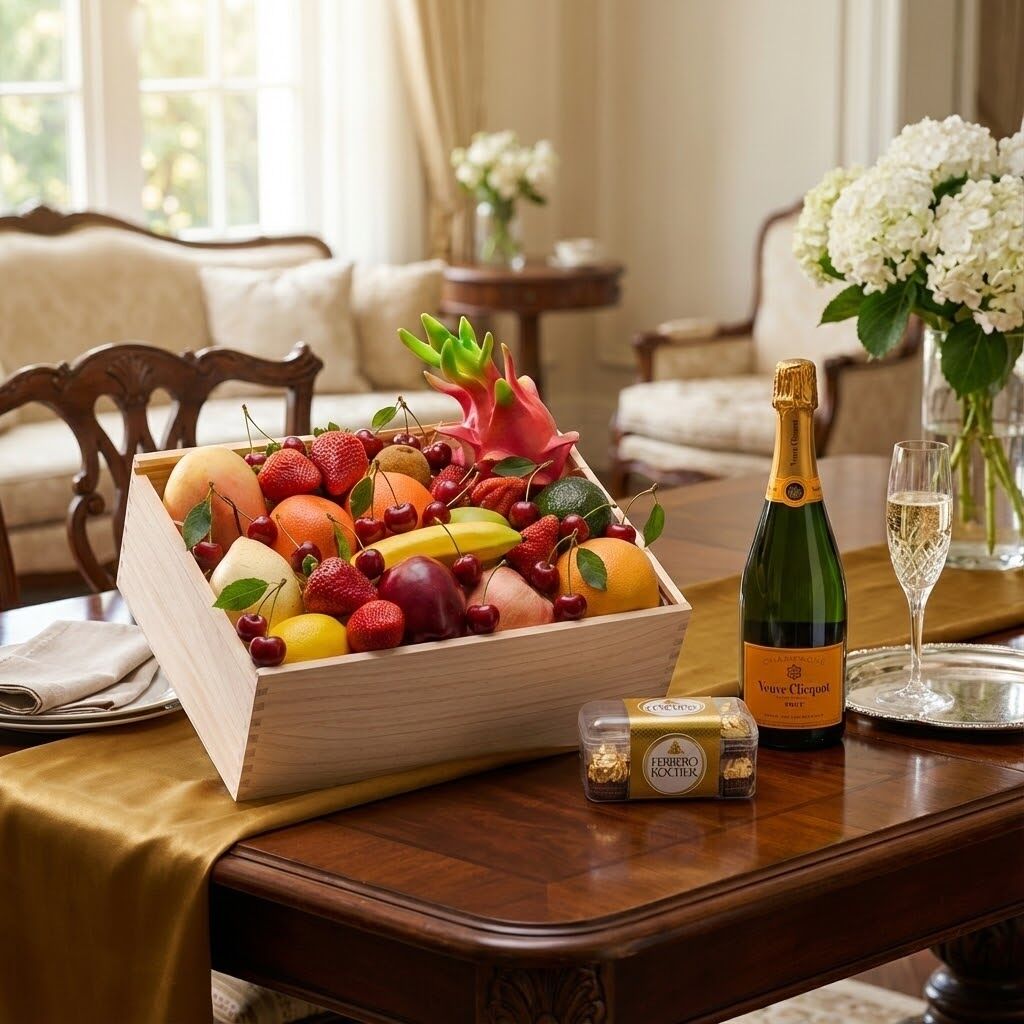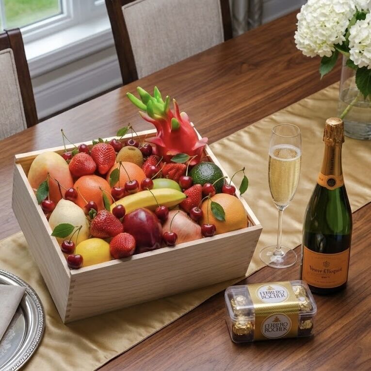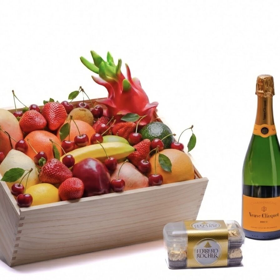 Blends fresh orchard vibrancy with golden chocolate indulgence and iconic champagne elegance. Featuring Premium Handpicked Seasonal Fruit paired with a Ferrero Rocher Chocolate Gift Box and Veuve Clicquot Yellow Label Brut NV, this refined hamper offers a harmonious balance of sweetness, texture and celebratory sparkle — perfect for anniversaries, settlements, engagements, birthdays or premium corporate gifting.